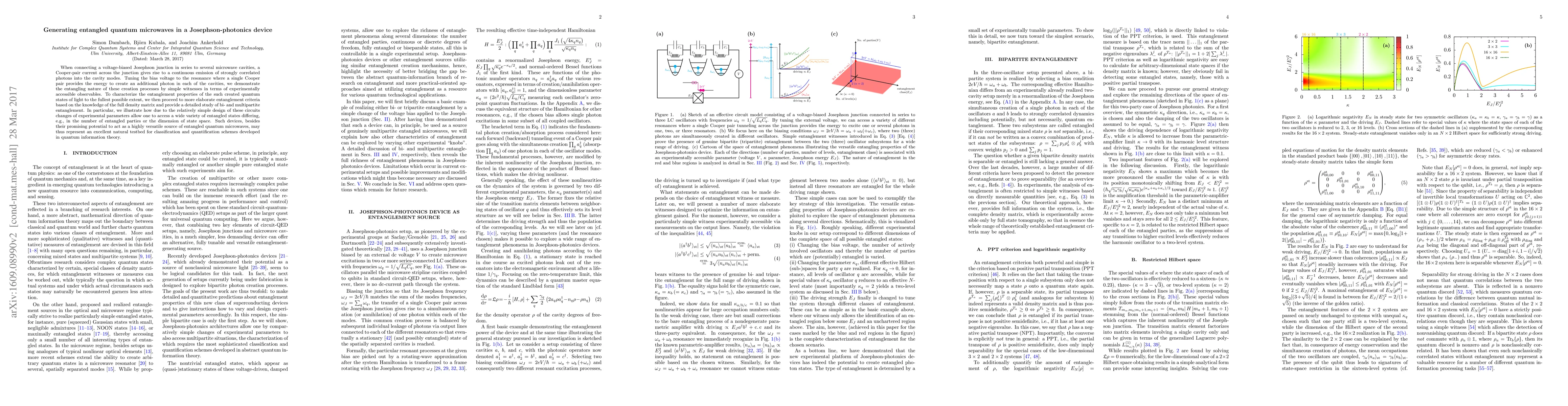 This paper demonstrates the generation of entangled quantum microwaves in a Josephson-photonics device by exploiting a voltage-biased Josephson junction connected to microwave cavities. The study provides detailed characterization of the entanglement properties and shows the potential of these devices as versatile sources for quantum information applications.