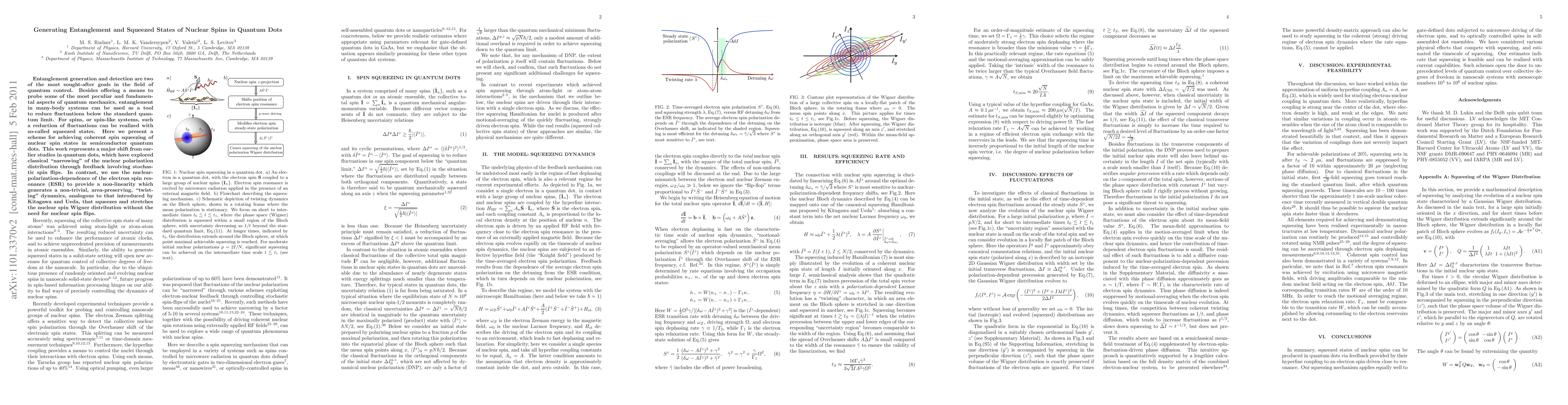 This paper presents a novel scheme for generating entangled and squeezed states of nuclear spins in quantum dots, utilizing electron spin resonance non-linearity to achieve coherent spin squeezing without nuclear spin flips, marking a significant advancement over previous methods.