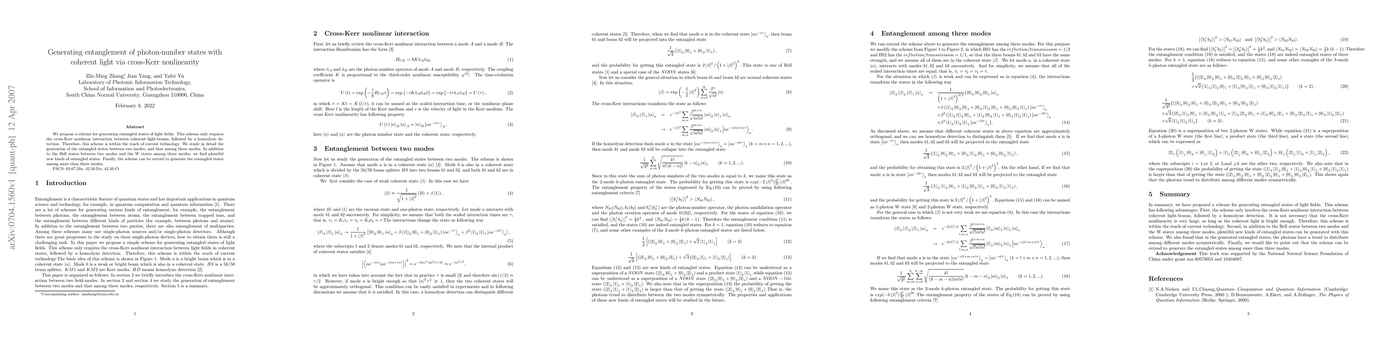 We propose a scheme for generating entangled states of light fields. This scheme only requires the cross-Kerr nonlinear interaction between coherent light-beams, followed by a homodyne detection. Therefore, this scheme is within the reach of current technology. We study in detail the generation of the entangled states between two modes, and that among three modes. In addition to the Bell states between two modes and the W states among three modes, we find plentiful new kinds of entangled states. Finally, the scheme can be extend to generate the entangled states among more than three modes.