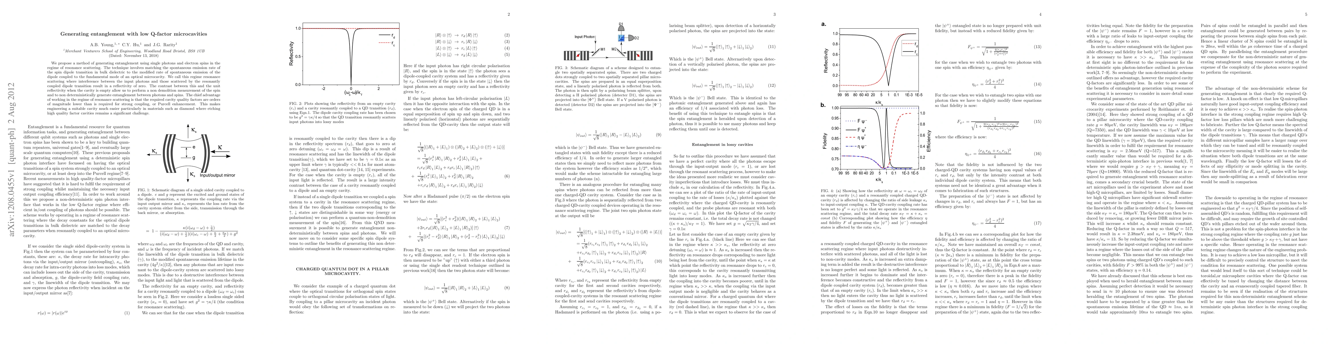 This paper proposes a novel method for generating entanglement using single photons and electron spins through resonance scattering in low Q-factor microcavities, achieving entanglement without requiring high-quality factor cavities, which simplifies engineering in materials like diamond.