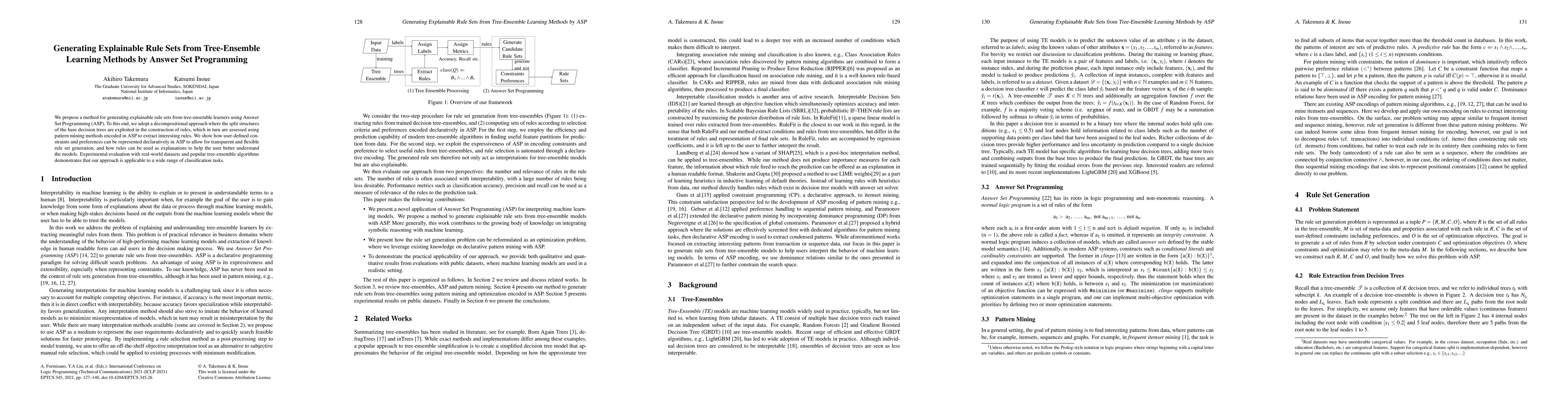 This paper proposes a method to generate explainable rule sets from tree-ensemble learners using Answer Set Programming (ASP). The approach decomposes the split structures of decision trees to construct rules, which are then evaluated using pattern mining methods encoded in ASP, allowing for transparent and flexible rule set generation based on user-defined constraints.