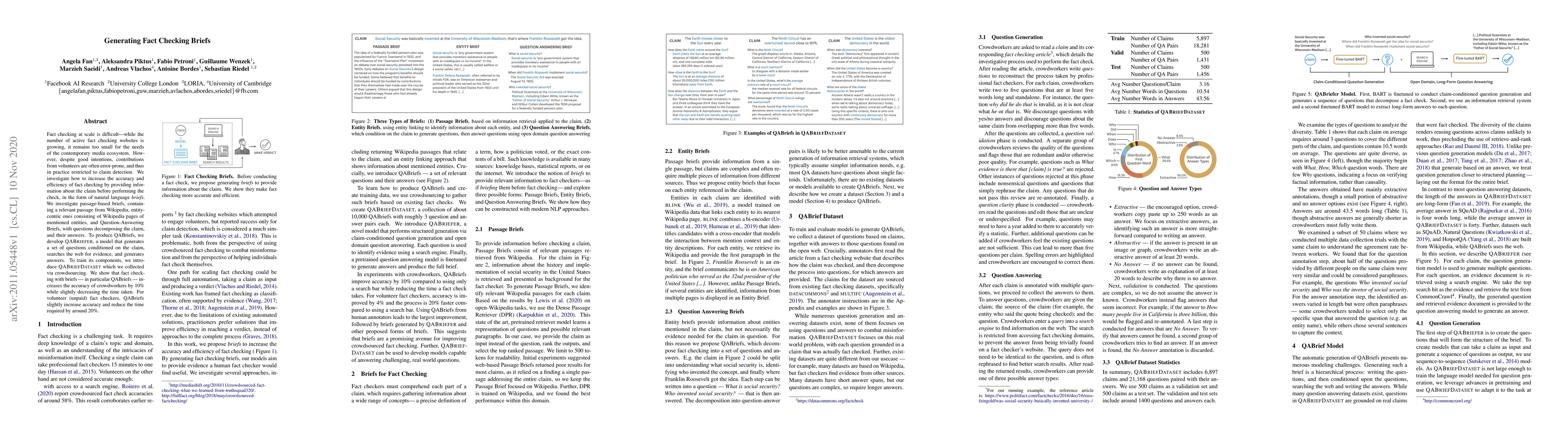 Fact checking at scale is difficult -- while the number of active fact checking websites is growing, it remains too small for the needs of the contemporary media ecosystem. However, despite good intentions, contributions from volunteers are often error-prone, and thus in practice restricted to claim detection. We investigate how to increase the accuracy and efficiency of fact checking by providing information about the claim before performing the check, in the form of natural language briefs. We investigate passage-based briefs, containing a relevant passage from Wikipedia, entity-centric ones consisting of Wikipedia pages of mentioned entities, and Question-Answering Briefs, with questions decomposing the claim, and their answers. To produce QABriefs, we develop QABriefer, a model that generates a set of questions conditioned on the claim, searches the web for evidence, and generates answers. To train its components, we introduce QABriefDataset which we collected via crowdsourcing. We show that fact checking with briefs -- in particular QABriefs -- increases the accuracy of crowdworkers by 10% while slightly decreasing the time taken. For volunteer (unpaid) fact checkers, QABriefs slightly increase accuracy and reduce the time required by around 20%.