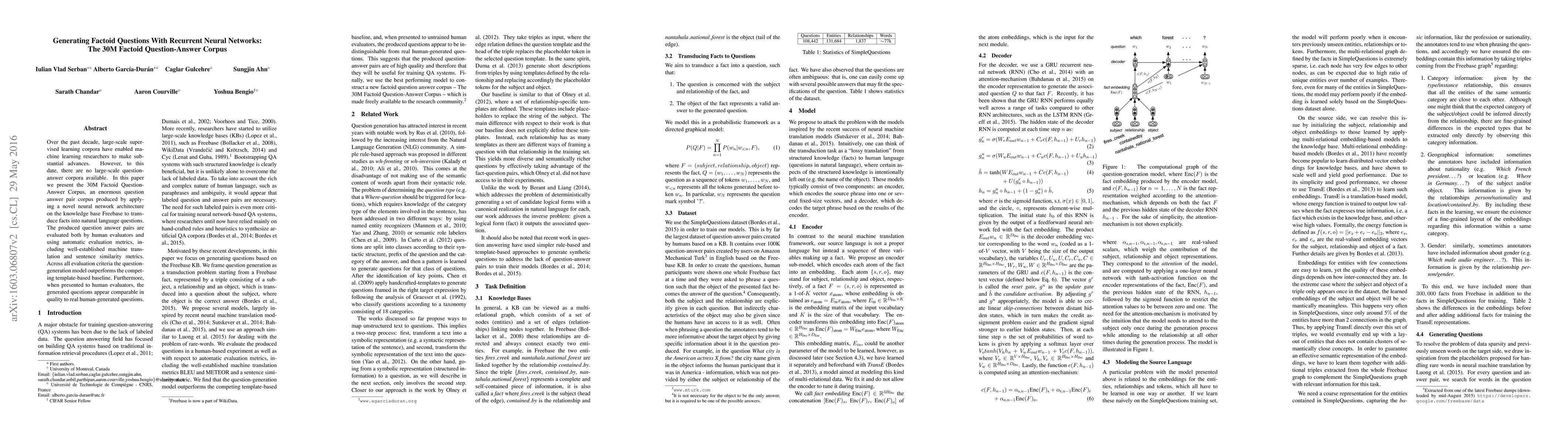 This paper introduces the 30M Factoid Question-Answer Corpus, a large-scale dataset of question-answer pairs generated using a recurrent neural network applied to the Freebase knowledge base. The model's output is shown to outperform template-based methods and is deemed comparable in quality to human-generated questions by both automatic metrics and human evaluators.