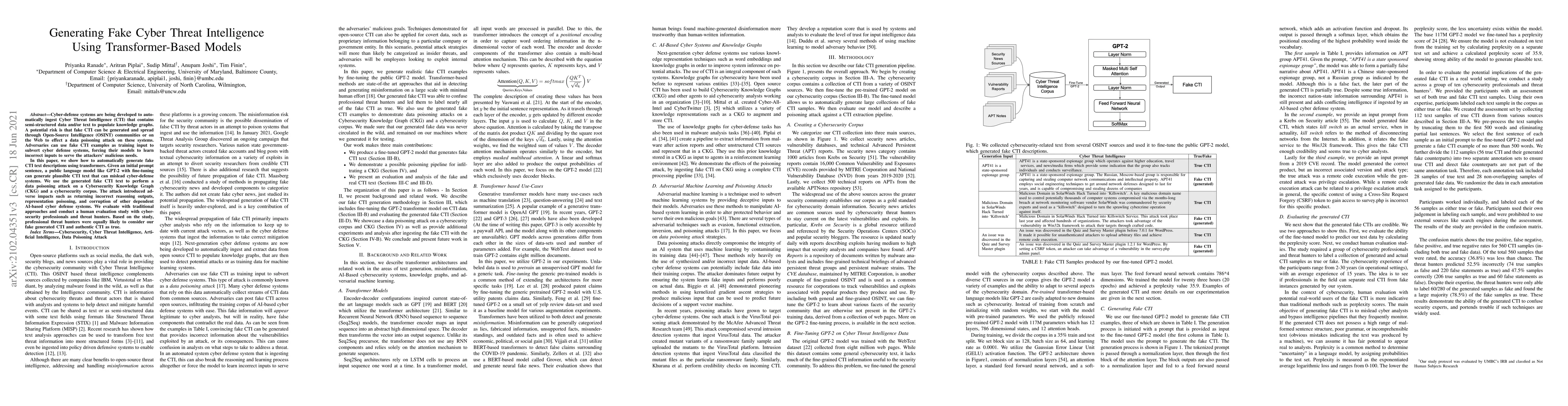 This paper explores the generation of fake Cyber Threat Intelligence (CTI) using transformer-based models like GPT-2 to corrupt cyber-defense systems. The study demonstrates the potential for data poisoning attacks through fake CTI, showing adverse impacts on cybersecurity knowledge graphs and AI-based defense systems, with human evaluations indicating threat professionals struggle to distinguish fake from real CTI.