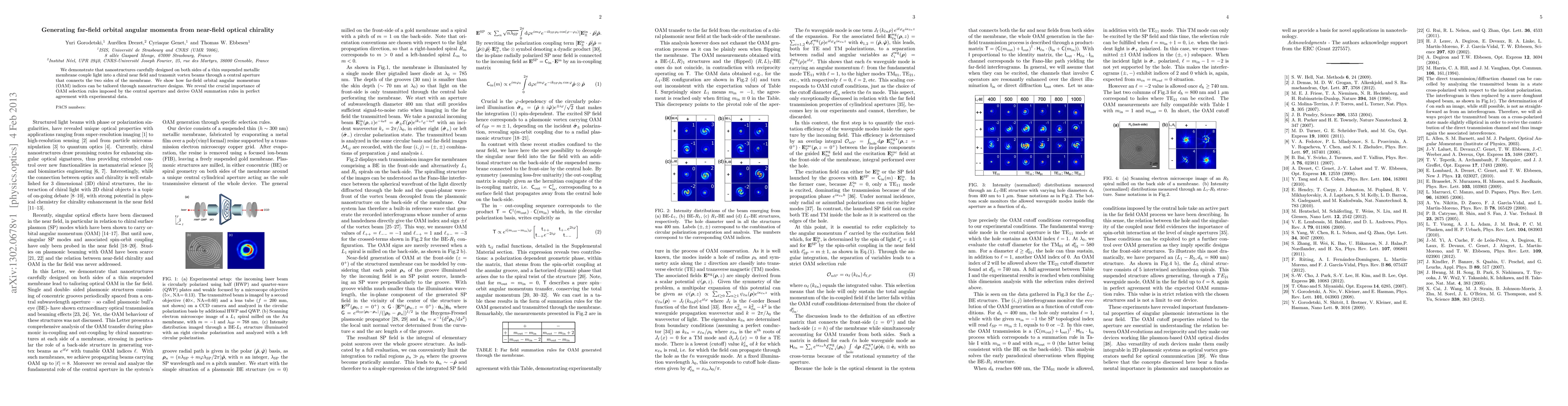 We demonstrate that nanostructures carefully designed on both sides of a thin suspended metallic membrane couple light into a chiral near field and transmit vortex beams through a central aperture that connects the two sides of the membrane. We show how far-field orbital angular momentum (OAM) indices can be tailored through nanostructure designs. We reveal the crucial importance of OAM selection rules imposed by the central aperture and derive OAM summation rules in perfect agreement with experimental data.