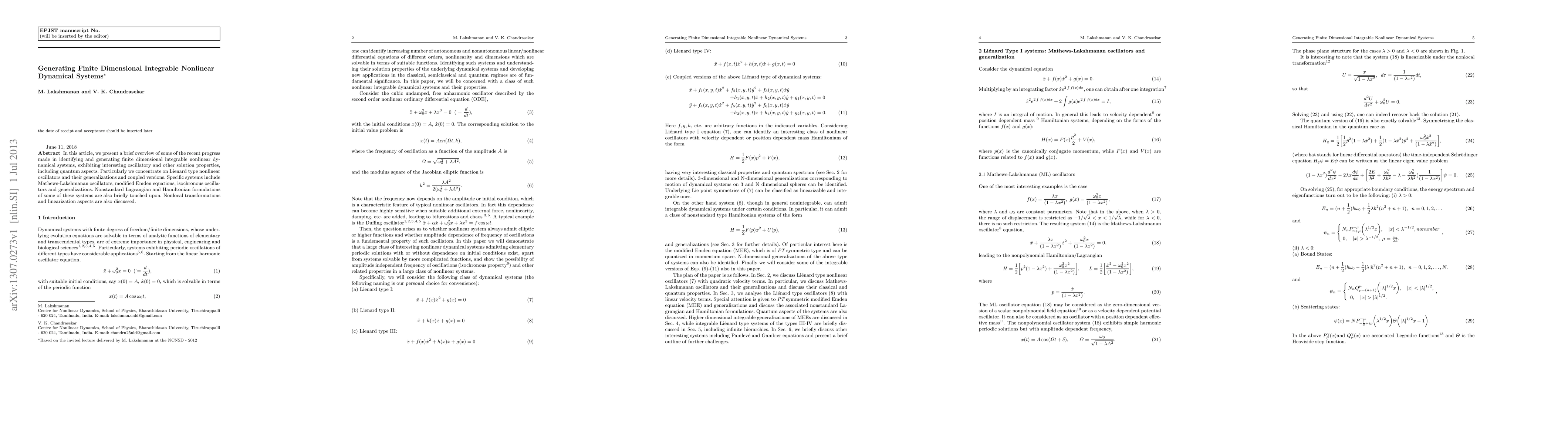 This paper reviews recent advancements in generating finite dimensional integrable nonlinear dynamical systems, focusing on Lienard-type oscillators and their variants, including Mathews-Lakshmanan oscillators and modified Emden equations. It also touches on nonstandard Lagrangian and Hamiltonian formulations, nonlocal transformations, and linearization aspects.