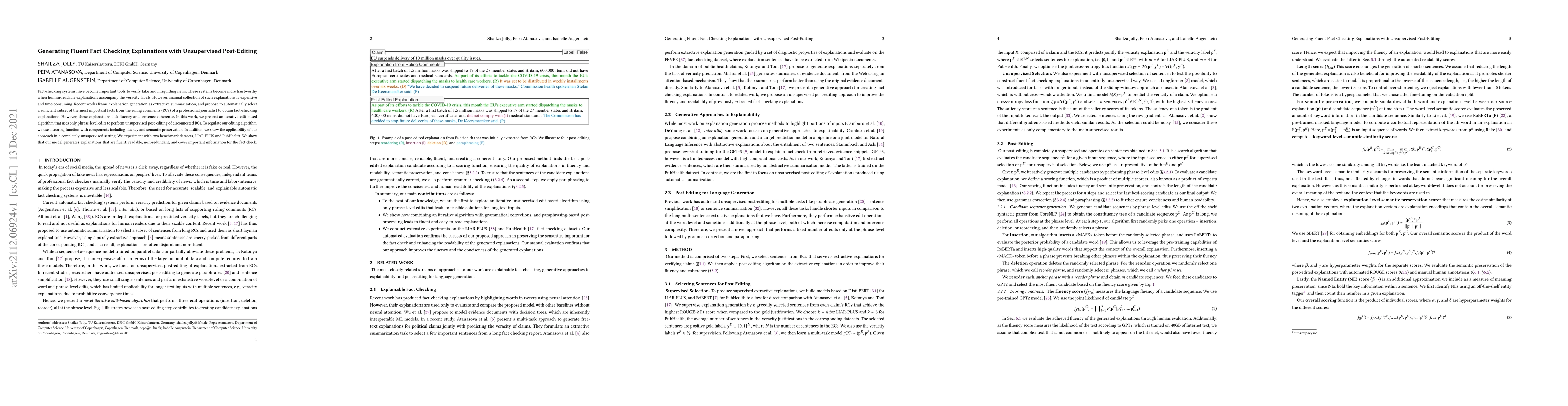 This paper proposes an unsupervised post-editing algorithm to generate fluent fact-checking explanations by iteratively refining disconnected ruling comments. The method uses a scoring function to ensure fluency and semantic preservation, demonstrating effectiveness on LIAR-PLUS and PubHealth datasets.