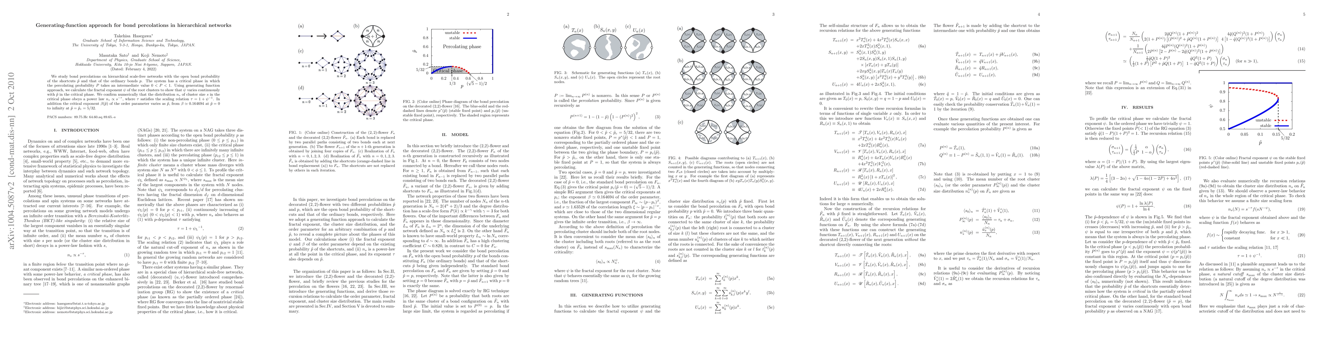 This study uses a generating function approach to analyze bond percolation in hierarchical scale-free networks. It finds that the fractal exponent of root clusters varies continuously with shortcut bond probability in the critical phase. Numerical confirmation shows a power-law distribution of cluster sizes, with the exponent tau related to the fractal exponent. The critical exponent of the order parameter varies with shortcut bond probability, changing from approximately 0.164694 at zero shortcuts to infinity at the critical threshold.