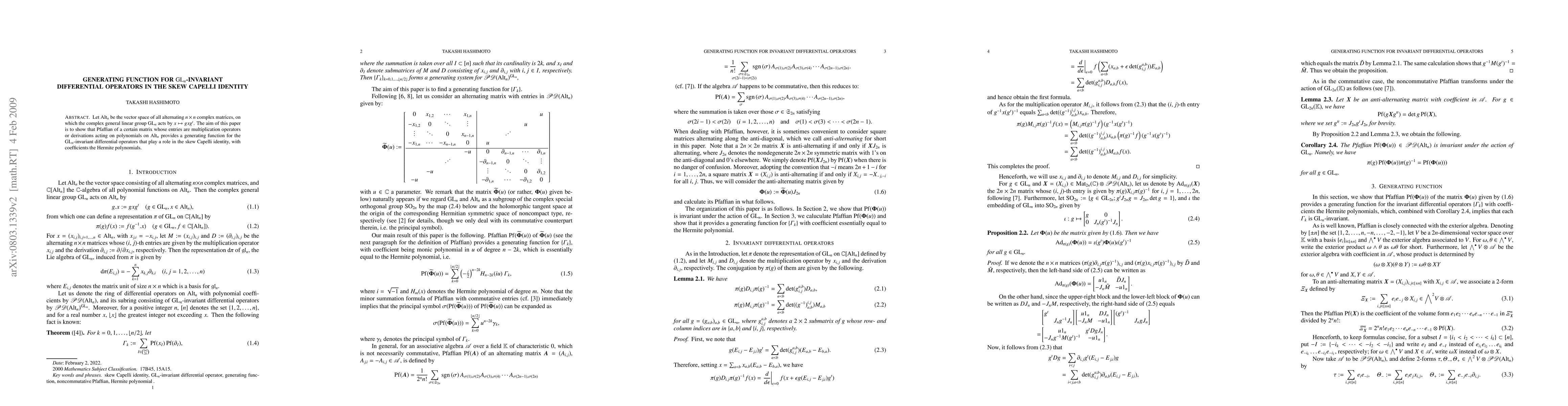 This paper establishes a generating function for GL_n-invariant differential operators related to the skew Capelli identity, using the Pfaffian of a matrix of multiplication or derivation operators on the space of alternating matrices, with Hermite polynomials as coefficients.