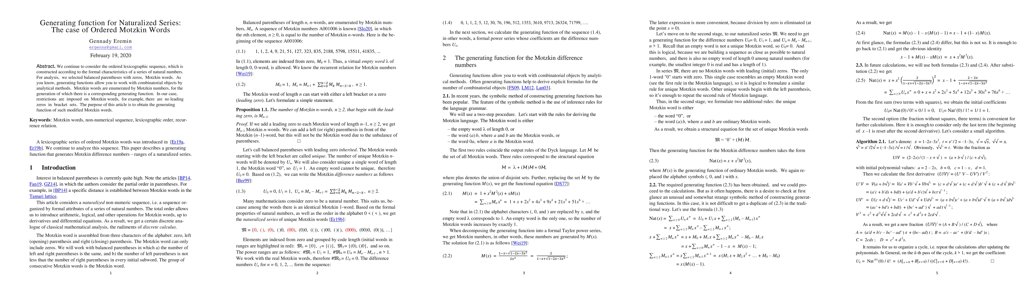 We continue to consider the ordered lexicographic sequence, which is constructed according to the formal characteristics of a series of natural numbers. For analysis, we selected balanced parentheses with zeros, Motzkin words. As you know, generating functions allow you to work with combinatorial objects by analytical methods. Motzkin words are enumerated by Motzkin numbers, for the generation of which there is a corresponding generating function. In our case, restrictions are imposed on Motzkin words, for example, there are no leading zeros in bracket sets. The purpose of this article is to obtain the generating function of such modified Motzkin words.