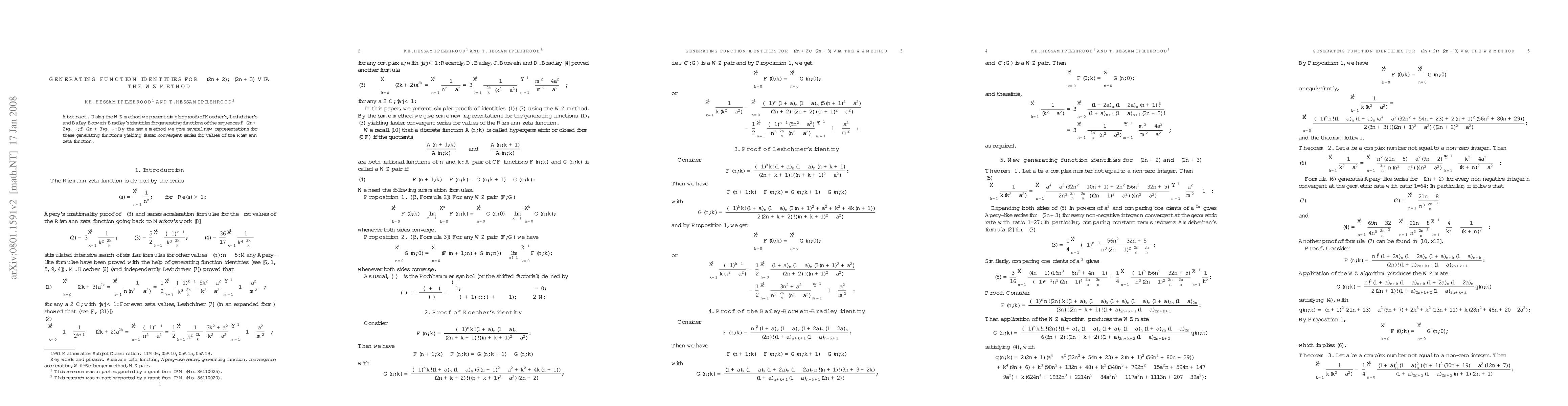 This paper utilizes the WZ (Wilf-Zeilberger) method to simplify proofs of known identities for generating functions of $\zeta(2n+2)$ and $\zeta(2n+3)$, and introduces new representations that lead to faster convergent series for the Riemann zeta function values.