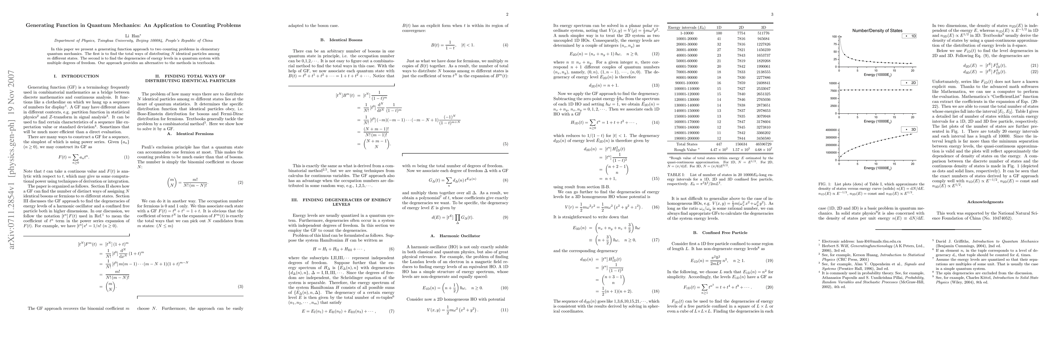 In this paper we present a generating function approach to two counting problems in elementary quantum mechanics. The first is to find the total ways of distributing identical particles among different states. The second is to find the degeneracies of energy levels in a quantum system with multiple degrees of freedom. Our approach provides an alternative to the methods in textbooks.