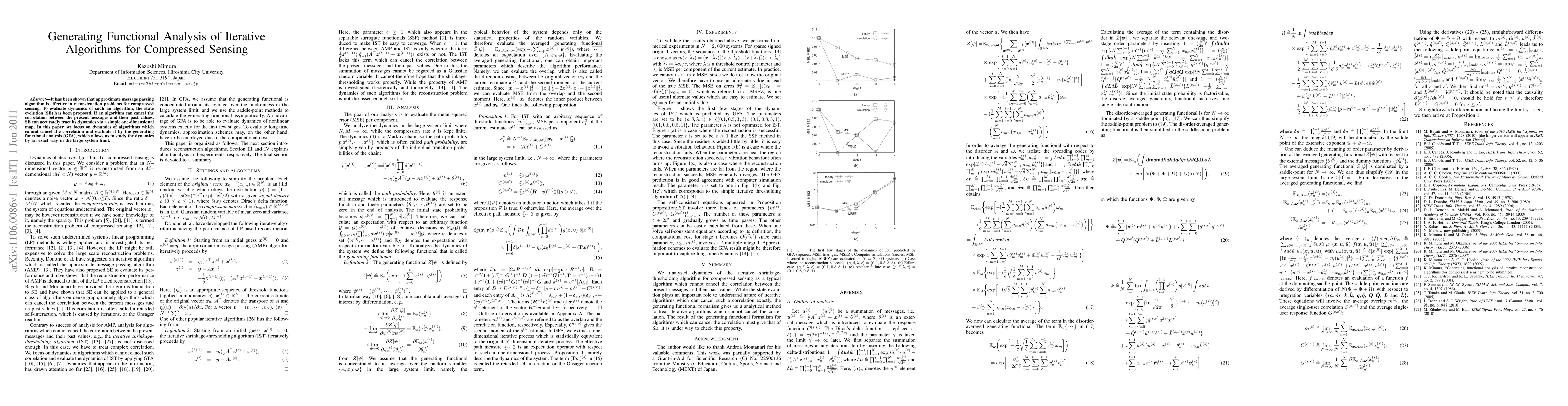 Researchers studied the dynamics of iterative algorithms for compressed sensing using generating functional analysis (GFA), revealing that these algorithms have non-cancellable correlation between past and present messages, limiting their ability to accurately reconstruct original signals.