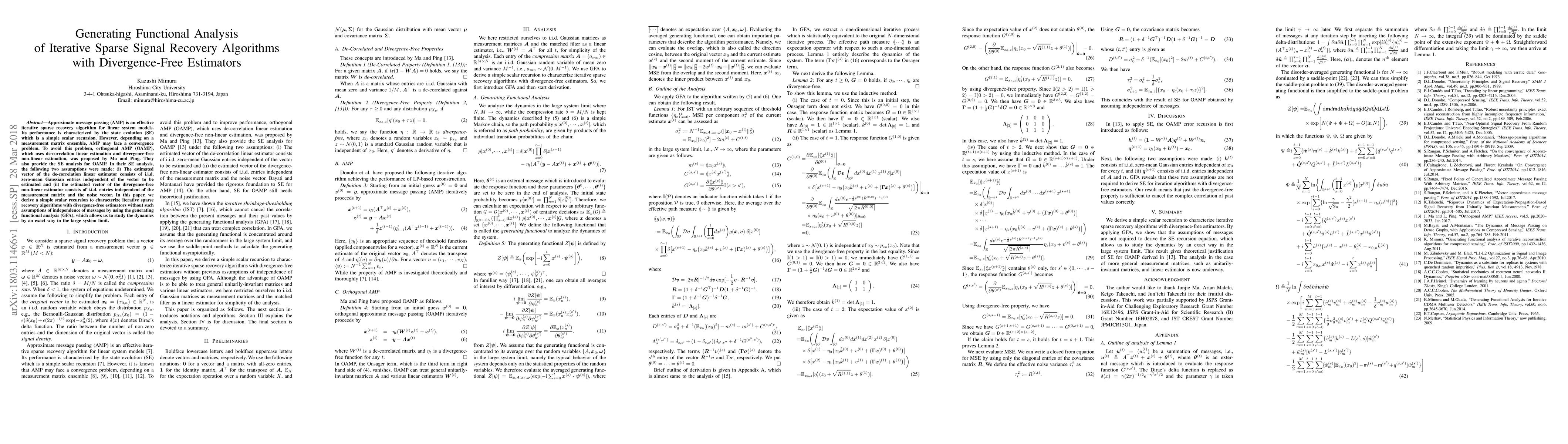 Approximate message passing (AMP) is an effective iterative sparse recovery algorithm for linear system models. Its performance is characterized by the state evolution (SE) which is a simple scalar recursion. However, depending on a measurement matrix ensemble, AMP may face a convergence problem. To avoid this problem, orthogonal AMP (OAMP), which uses de-correlation linear estimation and divergence-free non-linear estimation, was proposed by Ma and Ping. They also provide the SE analysis for OAMP. In their SE analysis, the following two assumptions were made: (i) The estimated vector of the de-correlation linear estimator consists of i.i.d. zero-mean Gaussian entries independent of the vector to be estimated and (ii) the estimated vector of the divergence-free non-linear estimator consists of i.i.d. entries independent of the measurement matrix and the noise vector. In this paper, we derive a simple scalar recursion to characterize iterative sparse recovery algorithms with divergence-free estimators without such assumptions of independence of messages by using the generating functional analysis (GFA), which allows us to study the dynamics by an exact way in the large system limit.