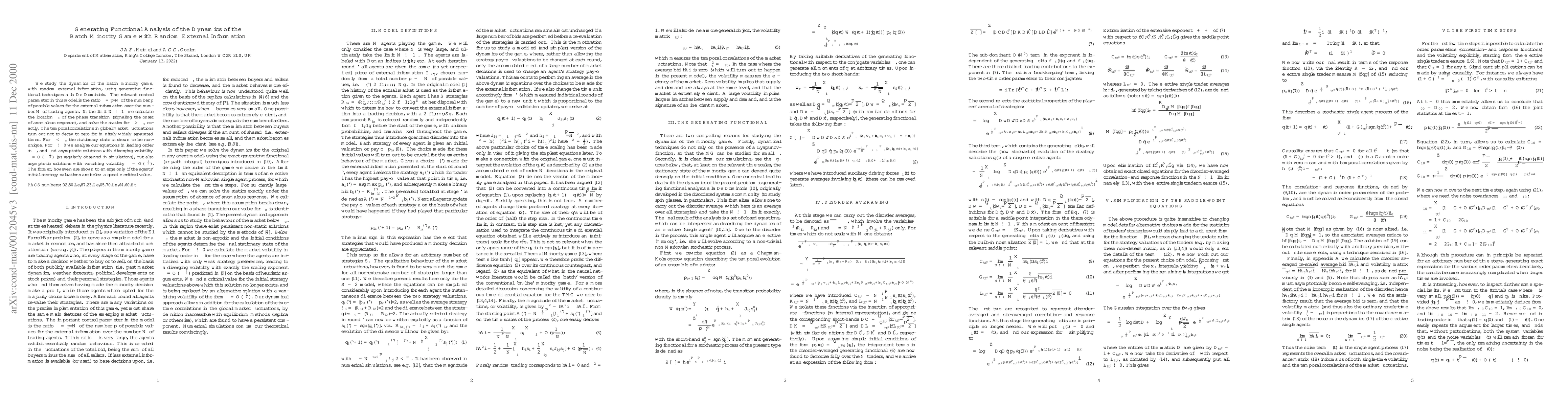 This paper employs generating functional analysis to study the dynamics of the batch minority game with random external information, identifying a phase transition at $\alpha_c$ and demonstrating non-unique stationary states for $\alpha<\alpha_c$. The study reveals persistent temporal correlations and distinct volatility behaviors depending on initial strategy valuations.