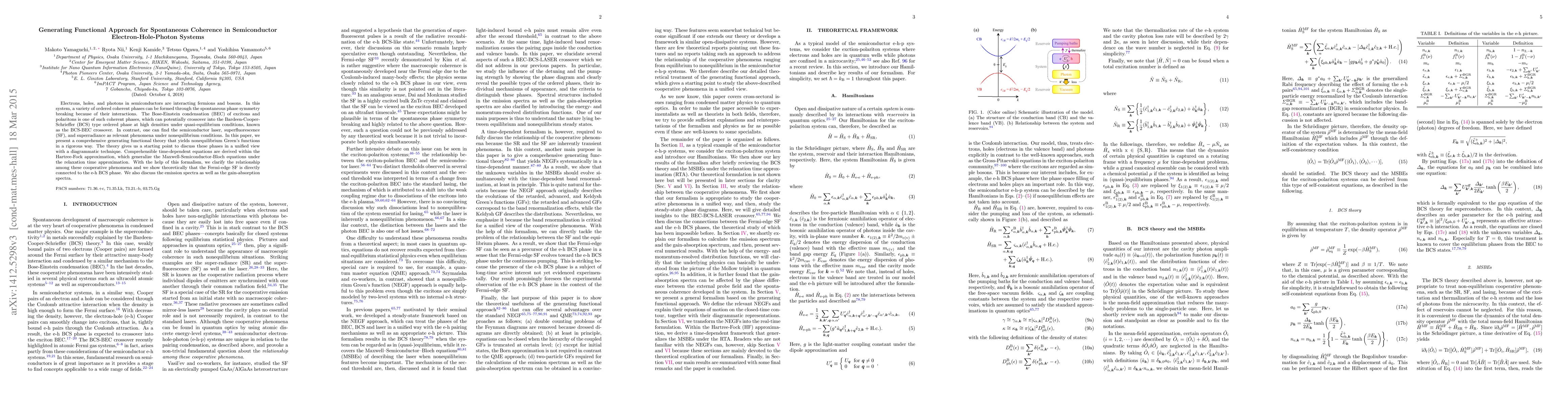 Electrons, holes, and photons in semiconductors are interacting fermions and bosons. In this system, a variety of ordered coherent phases can be formed through the spontaneous phase symmetry breaking because of their interactions. The Bose-Einstein condensation (BEC) of excitons and polaritons is one of such coherent phases, which can potentially crossover into the Bardeen-Cooper-Schrieffer (BCS) type ordered phase at high densities under quasi-equilibrium conditions, known as the BCS-BEC crossover. In contrast, one can find the semiconductor laser, superfluorescence (SF), and superradiance as relevant phenomena under nonequilibrium conditions. In this paper, we present a comprehensive generating functional theory that yields nonequilibrium Green's functions in a rigorous way. The theory gives us a starting point to discuss these phases in a unified view with a diagrammatic technique. Comprehensible time-dependent equations are derived within the Hartree-Fock approximation, which generalize the Maxwell-Semiconductor-Bloch equations under the relaxation time approximation. With the help of this formalism, we clarify the relationship among these cooperative phenomena and we show theoretically that the Fermi-edge SF is directly connected to the e-h BCS phase. We also discuss the emission spectra as well as the gain-absorption spectra.