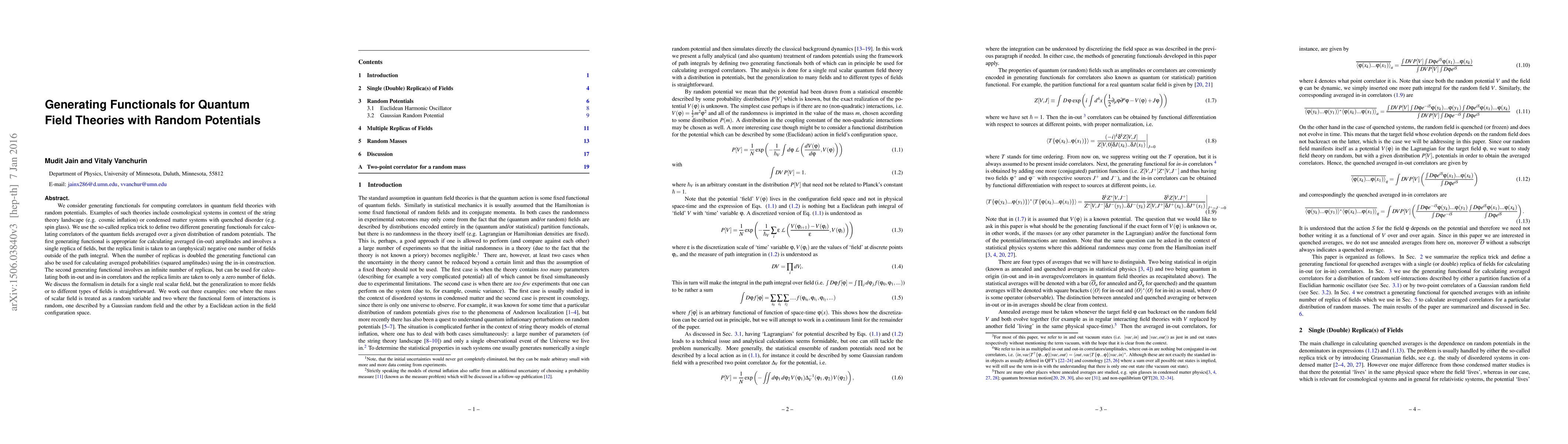 We consider generating functionals for computing correlators in quantum field theories with random potentials. Examples of such theories include condensed matter systems with quenched disorder (e.g. spin glass) or cosmological systems in context of the string theory landscape (e.g. cosmic inflation). We use the so-called replica trick to define two different generating functionals for calculating correlators of the quantum fields averaged over a given distribution of random potentials. The first generating functional is appropriate for calculating averaged (in-out) amplitudes and involves a single replica of fields, but the replica limit is taken to an (unphysical) negative one number of fields outside of the path integral. When the number of replicas is doubled the generating functional can also be used for calculating averaged probabilities (squared amplitudes) using the in-in construction. The second generating functional involves an infinite number of replicas, but can be used for calculating both in-out and in-in correlators and the replica limits are taken to only a zero number of fields. We discuss the formalism in details for a single real scalar field, but the generalization to more fields or to different types of fields is straightforward. We work out three examples: one where the mass of scalar field is treated as a random variable and two where the functional form of interactions is random, one described by a Gaussian random field and the other by a Euclidean action in the field configuration space.