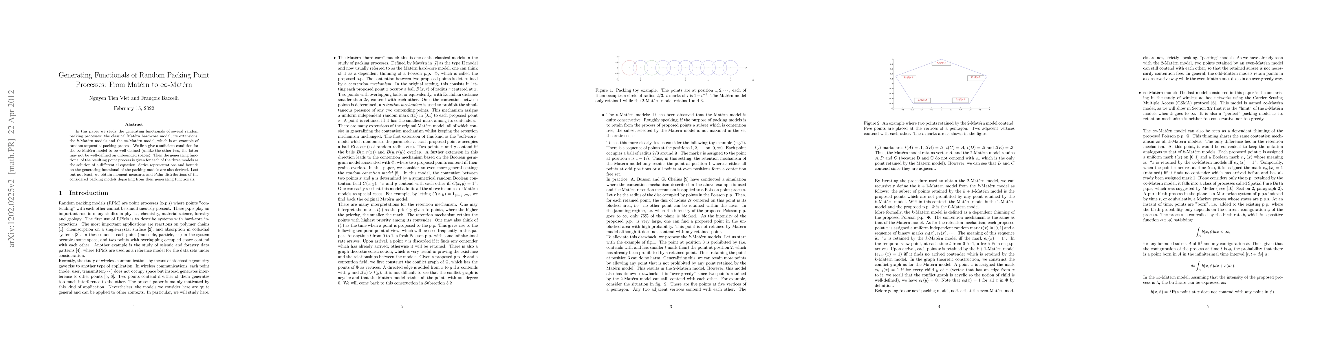 This paper explores generating functionals for various random packing point processes, including the Matérn hard-core model and its extensions. It establishes a condition for the well-definedness of the $\infty$-Matérn model and provides differential equation solutions for the generating functionals of all three models, along with series representations and bounds. Additionally, it derives moment measures and Palm distributions from these generating functionals.