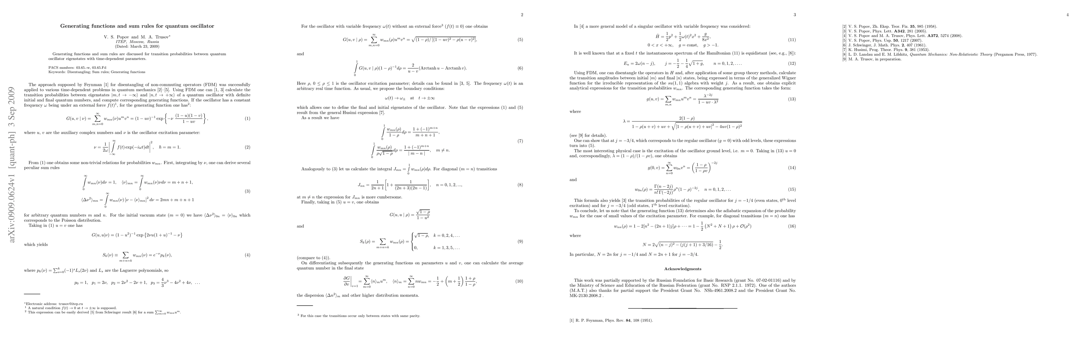 Summary: This paper explores generating functions and sum rules for transition probabilities between quantum oscillator eigenstates under varying time-dependent parameters, providing insights into the dynamics of such systems.