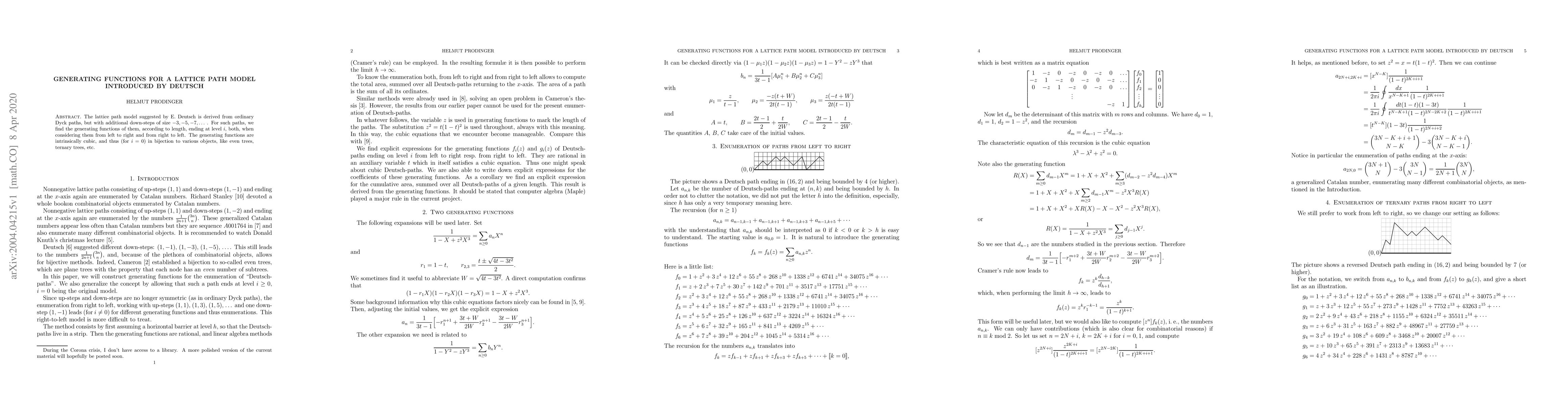The lattice path model suggested by E. Deutsch is derived from ordinary Dyck paths, but with additional down-steps of size -3,-5,-7,... . For such paths, we find the generating functions of them, according to length, ending at level $i$, both, when considering them from left to right and from right to left. The generating functions are intrinsically cubic, and thus (for $i=0$) in bijection to various objects, like even trees, ternary trees, etc.