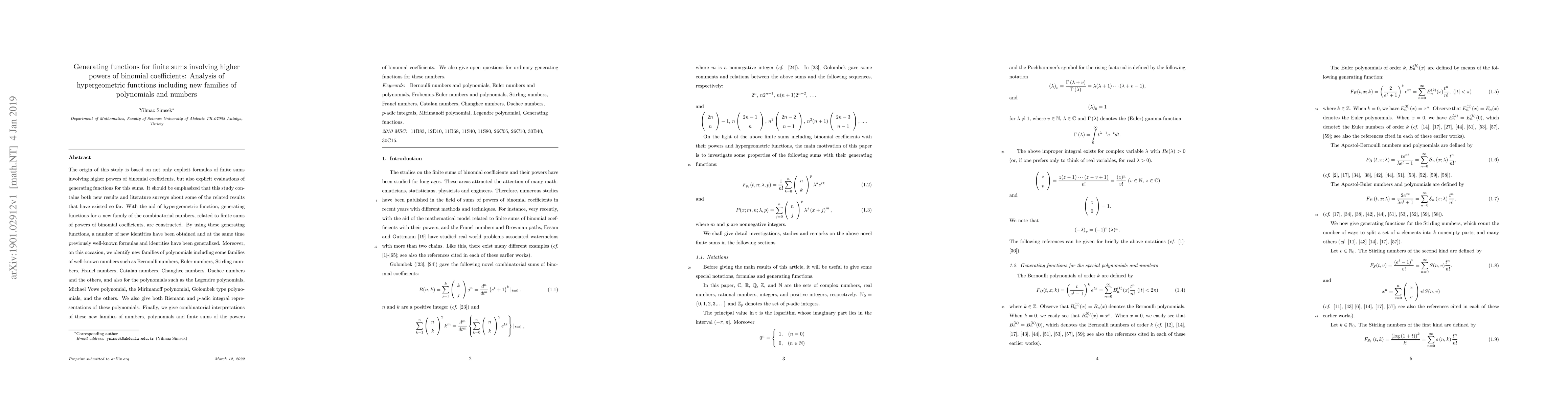 This paper explores generating functions for finite sums involving higher powers of binomial coefficients, utilizing hypergeometric functions to construct new families of combinatorial numbers and polynomials. It generalizes existing identities and introduces new families of well-known numbers and polynomials, providing both Riemann and $p$-adic integral representations, along with combinatorial interpretations.