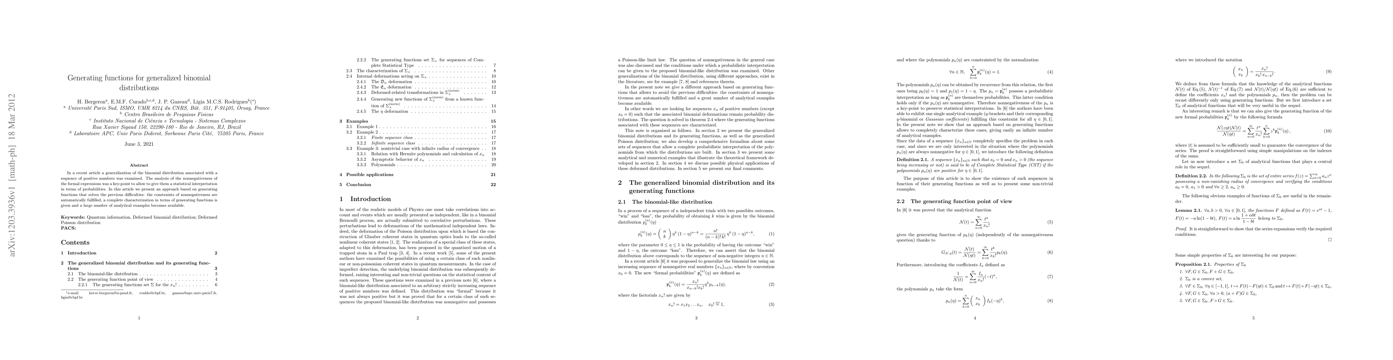 In a recent article a generalization of the binomial distribution associated with a sequence of positive numbers was examined. The analysis of the nonnegativeness of the formal expressions was a key-point to allow to give them a statistical interpretation in terms of probabilities. In this article we present an approach based on generating functions that solves the previous difficulties: the constraints of nonnegativeness are automatically fulfilled, a complete characterization in terms of generating functions is given and a large number of analytical examples becomes available.