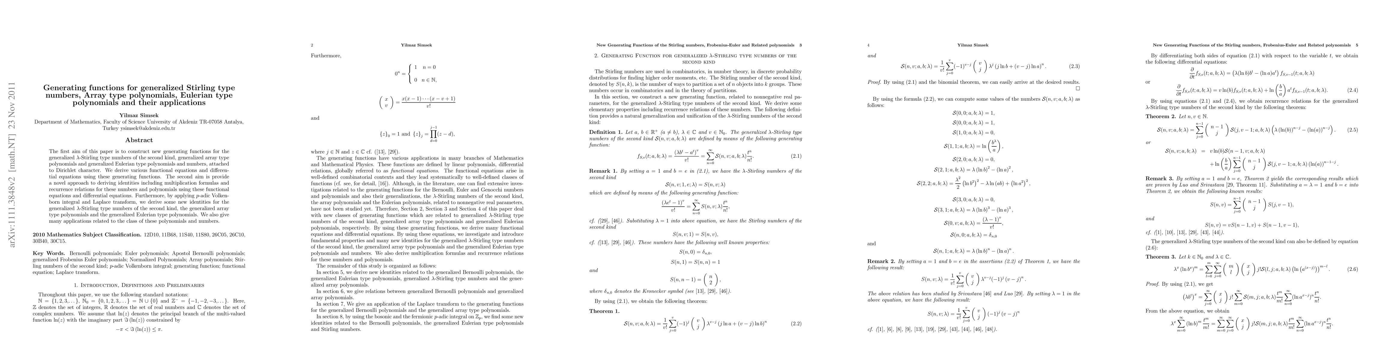 This paper introduces new generating functions for generalized Stirling numbers, array polynomials, and Eulerian polynomials, leading to novel identities and applications in combinatorics and number theory.