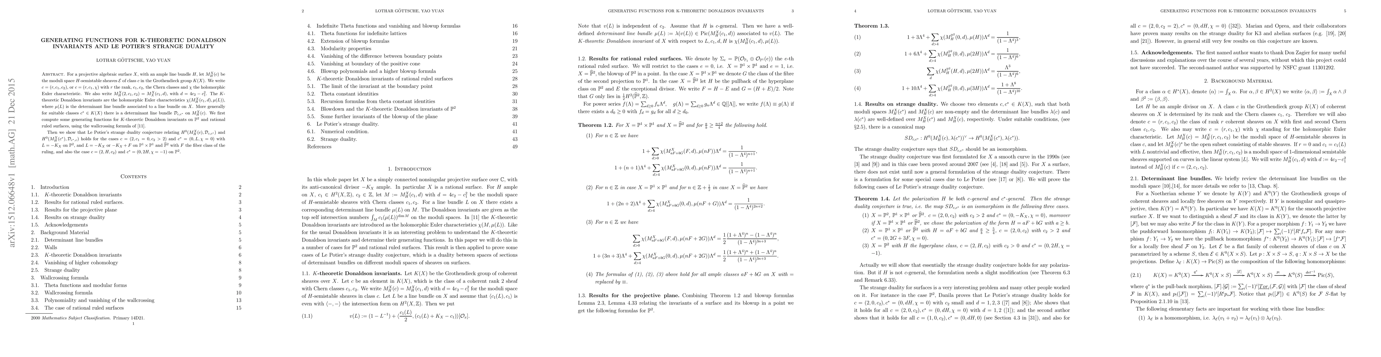 This paper computes generating functions for K-theoretic Donaldson invariants on the projective plane and rational ruled surfaces, and uses these results to support specific cases of Le Potier's strange duality.