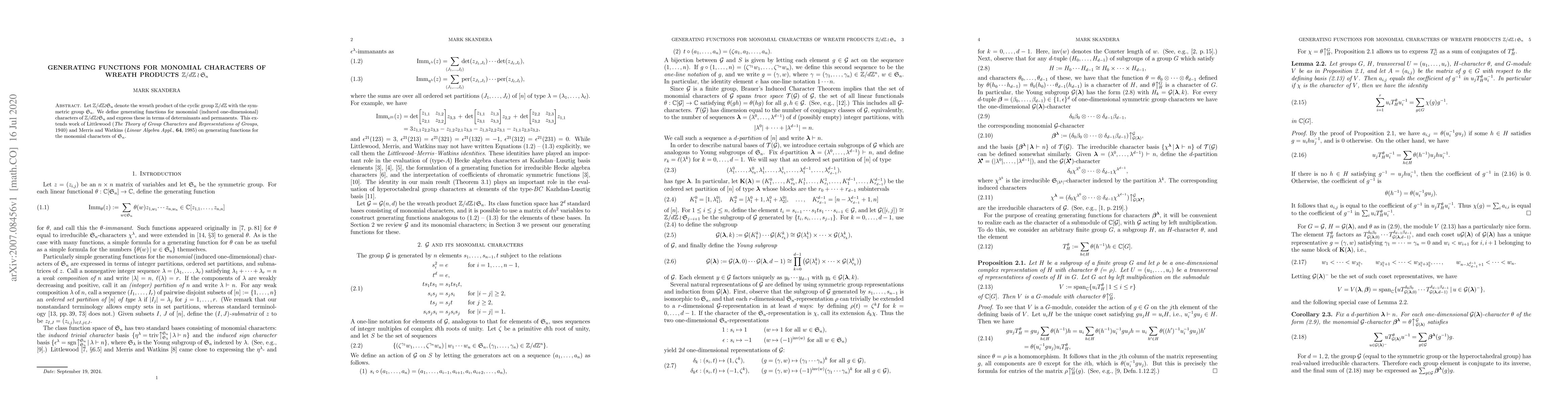 This paper defines generating functions for monomial characters of the wreath product $\mathbb{Z}/d\mathbb{Z} \wr \mathfrak{S}_n$, expressing them in terms of determinants and permanents, extending previous work on symmetric group characters.