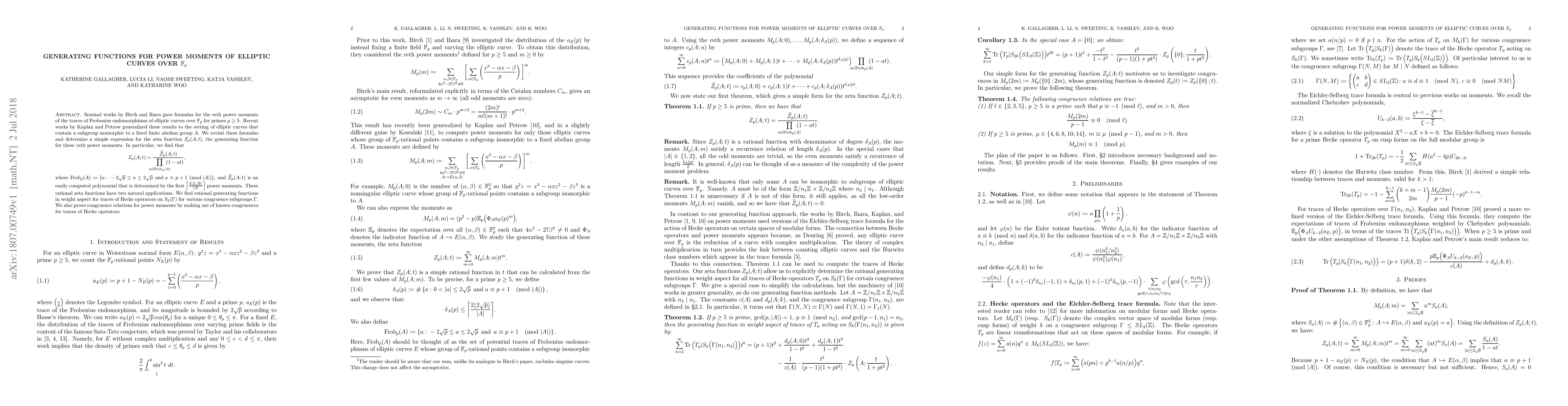 This paper revisits formulas for the $m$th power moments of elliptic curves over $\mathbb{F}_p$ and generalizes them to curves with a subgroup isomorphic to a finite abelian group $A$. It derives a generating function for these moments, $Z_p(A;t)$, and proves its rational form, with applications to traces of Hecke operators and congruence relations.