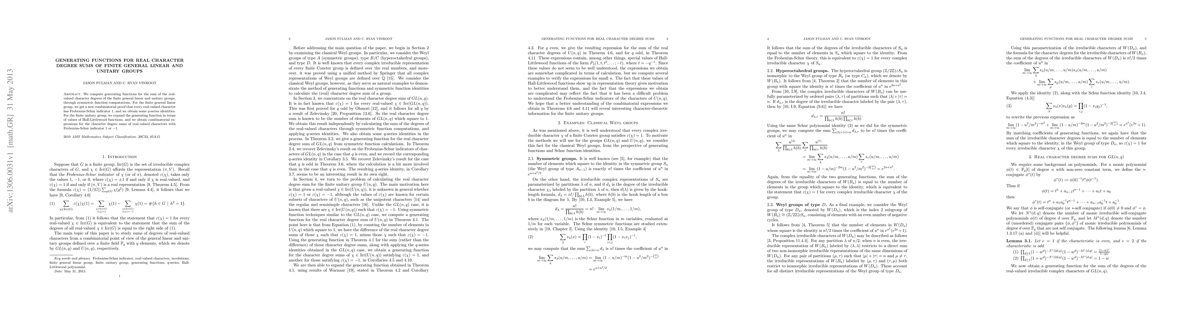 This paper computes generating functions for the sum of real-valued character degrees of finite general linear and unitary groups using symmetric function computations. It provides a new combinatorial proof for the Frobenius-Schur indicator of real-valued characters in the general linear group and derives q-series identities, while for the unitary group, it expresses the generating function in terms of Hall-Littlewood functions and finds combinatorial expressions for character degree sums.