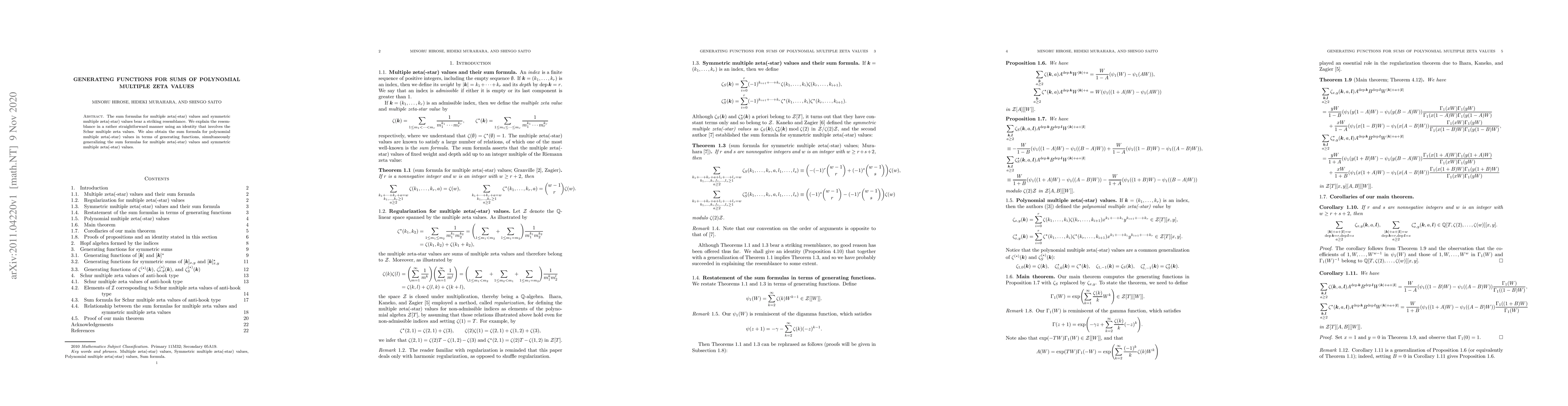 The sum formulas for multiple zeta(-star) values and symmetric multiple zeta(-star) values bear a striking resemblance. We explain the resemblance in a rather straightforward manner using an identity that involves the Schur multiple zeta values. We also obtain the sum formula for polynomial multiple zeta(-star) values in terms of generating functions, simultaneously generalizing the sum formulas for multiple zeta(-star) values and symmetric multiple zeta(-star) values.
