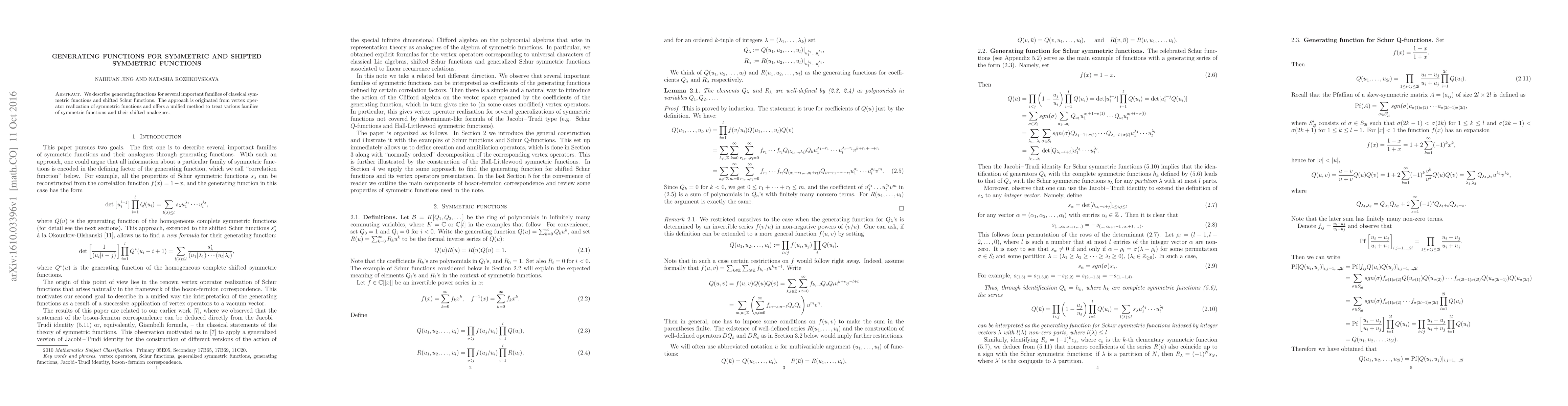 Summary: This paper presents generating functions for classical symmetric functions and shifted Schur functions, utilizing a vertex operator realization approach for a unified treatment of these families. The method offers a novel perspective on generating functions for these important mathematical objects.