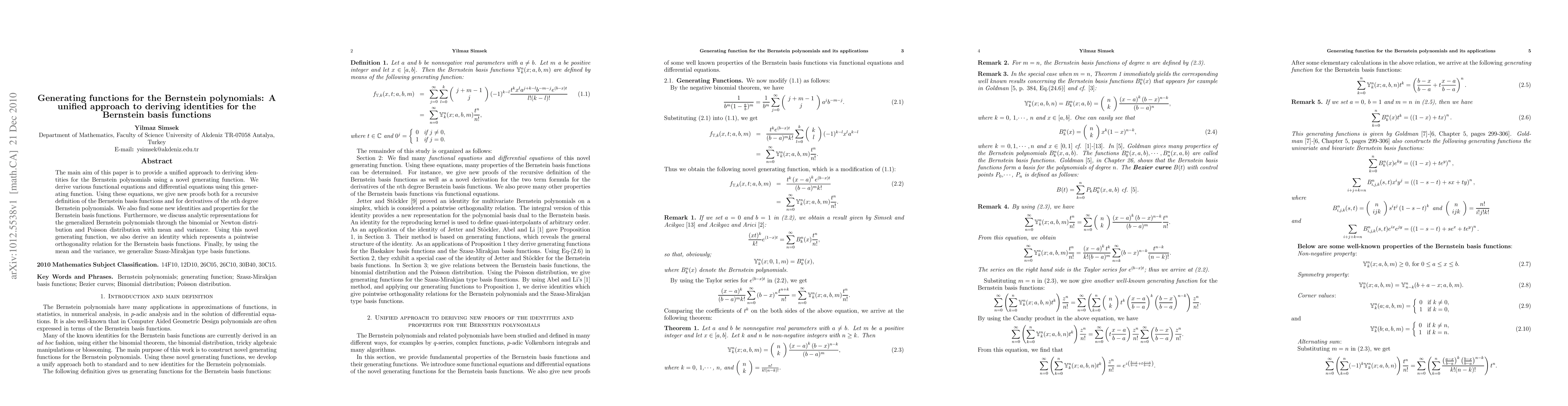 The main aim of this paper is to provide a unified approach to deriving identities for the Bernstein polynomials using a novel generating function. We derive various functional equations and differential equations using this generating function. Using these equations, we give new proofs both for a recursive definition of the Bernstein basis functions and for derivatives of the nth degree Bernstein polynomials. We also find some new identities and properties for the Bernstein basis functions. Furthermore, we discuss analytic representations for the generalized Bernstein polynomials through the binomial or Newton distribution and Poisson distribution with mean and variance. Using this novel generating function, we also derive an identity which represents a pointwise orthogonality relation for the Bernstein basis functions. Finally, by using the mean and the variance, we generalize Szasz-Mirakjan type basis functions.