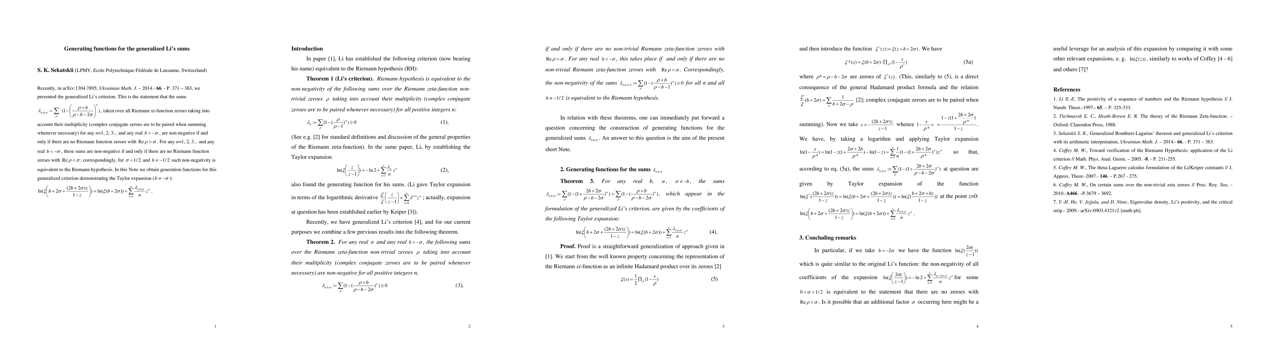 This paper presents generating functions for generalized Li's sums, which are sums involving Riemann xi-function zeroes. The study reveals that these sums are non-negative under specific conditions related to the Riemann hypothesis, and it provides a Taylor expansion for the generating function of these sums.
