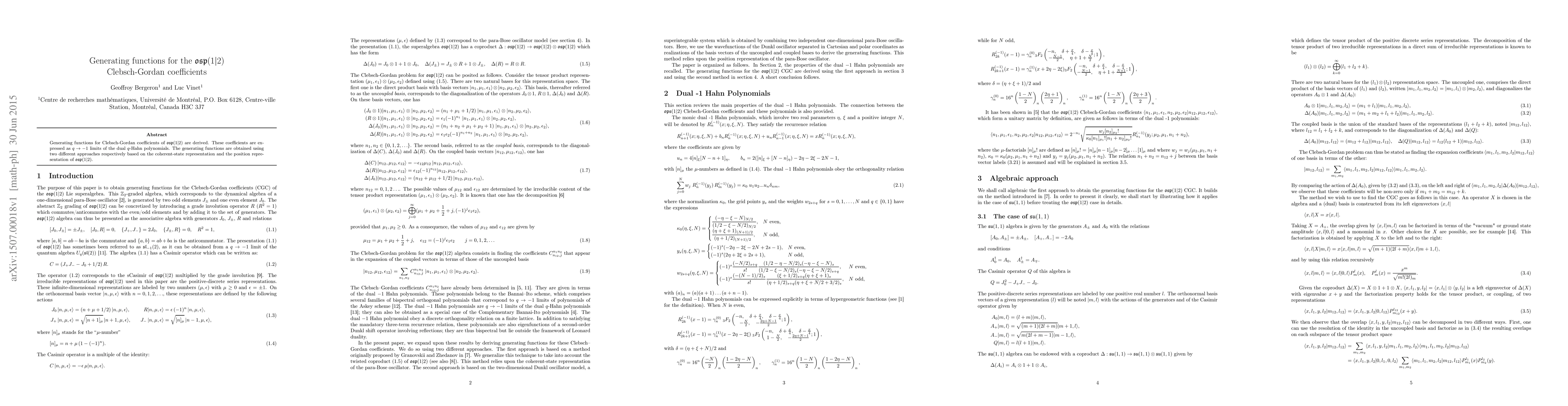 The paper derives generating functions for the osp(1|2) Clebsch-Gordan coefficients by expressing them as limits of dual q-Hahn polynomials and obtaining generating functions through coherent-state and position representations of osp(1j2).