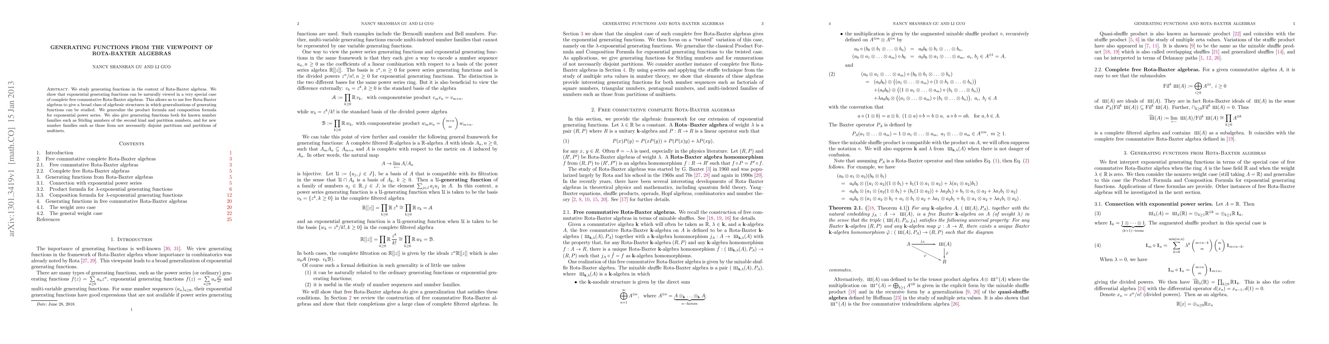 This paper explores the relationship between generating functions and Rota-Baxter algebras, particularly showing how exponential generating functions fit into complete free commutative Rota-Baxter algebras. It generalizes product and composition formulas for exponential power series and extends generating functions to new number families beyond traditional partitions.