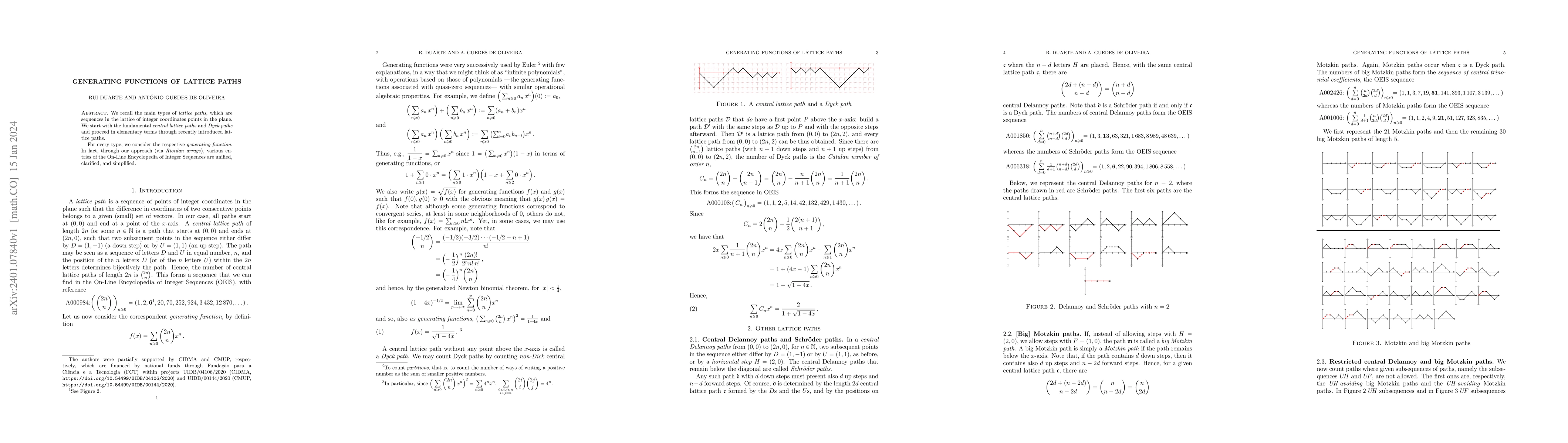 This paper explores various types of lattice paths using generating functions, focusing on central lattice paths and Dyck paths, and employs Riordan arrays to unify and simplify entries in the On-Line Encyclopedia of Integer Sequences.
