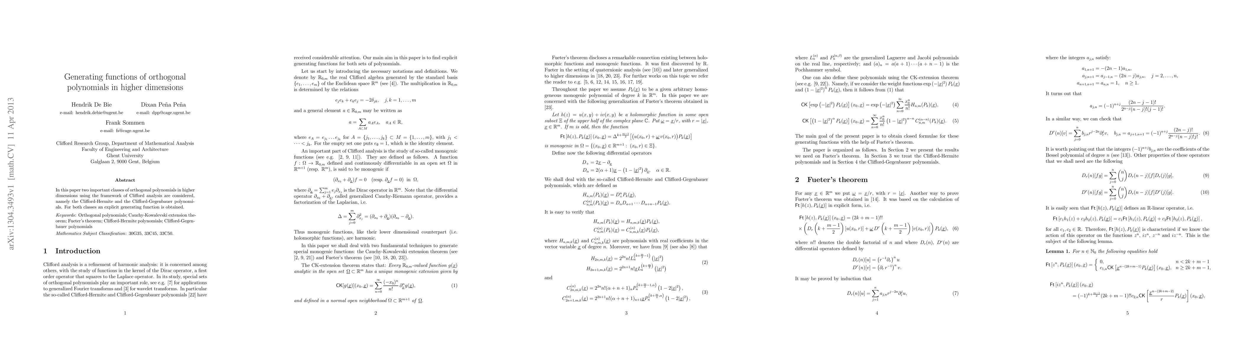 This paper explores orthogonal polynomials in higher dimensions, specifically Clifford-Hermite and Clifford-Gegenbauer polynomials, utilizing Clifford analysis, and derives explicit generating functions for both classes.