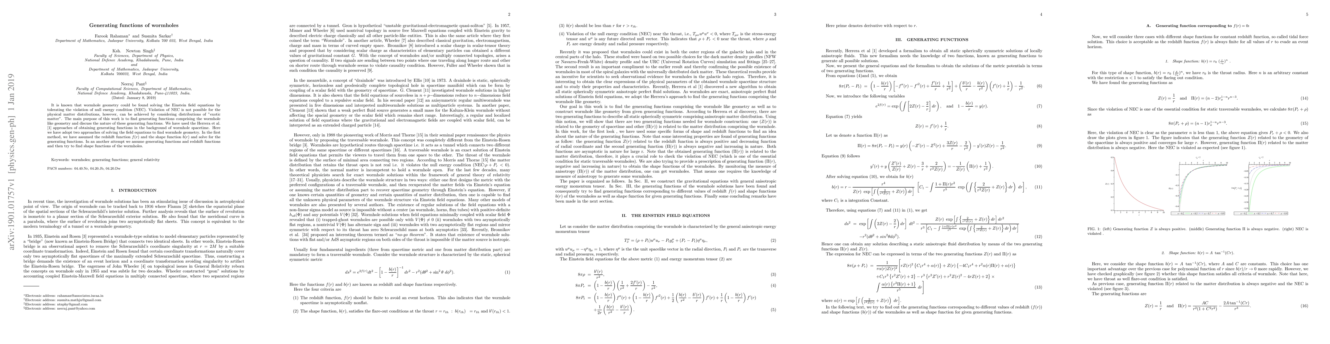 This paper explores generating functions for wormhole geometries derived from solutions to the Einstein field equations, focusing on exotic matter distributions that violate the null energy condition. It employs Herrera et al.'s methods to find these functions, using two approaches: one solving for generating functions given the redshift and shape functions, and another assuming generating and redshift functions to determine shape functions.