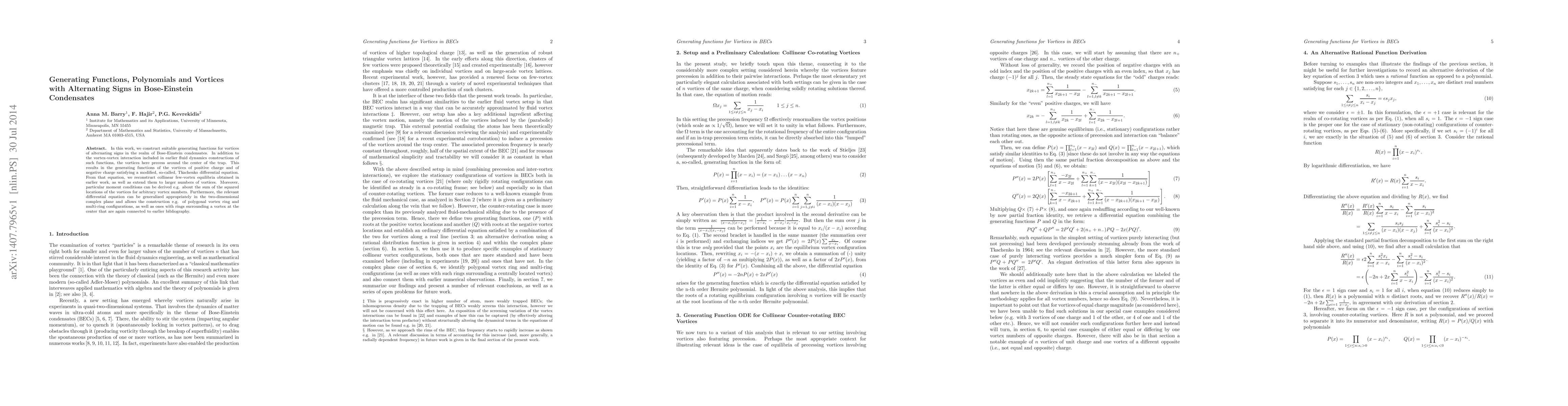 This paper constructs generating functions for vortices of alternating signs in Bose-Einstein condensates, incorporating vortex precession and resulting in modified Tkachenko differential equations. It extends previous equilibria to larger vortex numbers and generalizes the equation to construct polygonal and multi-ring vortex configurations.