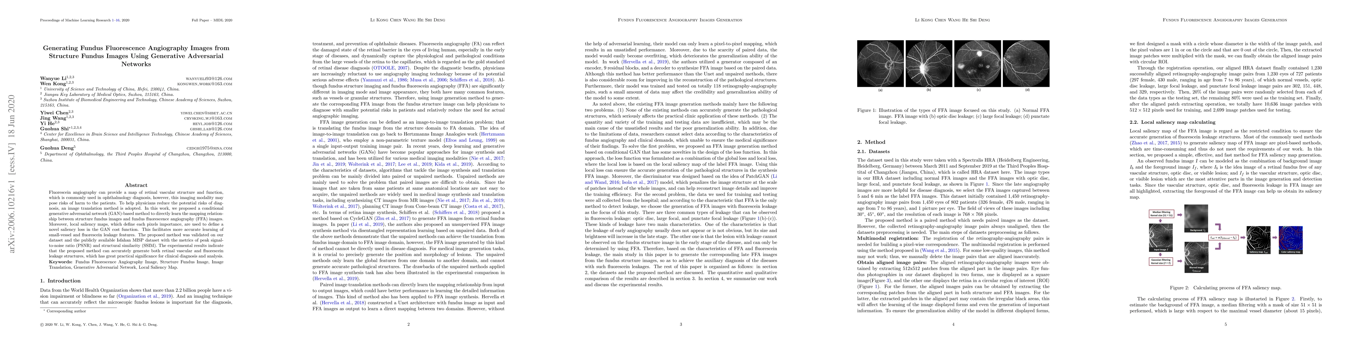 This paper proposes a conditional GAN method to translate structure fundus images into fundus fluorescence angiography images, aiming to reduce patient risks associated with traditional angiography. The method incorporates local saliency maps to enhance the learning of small-vessel and fluorescein leakage features.