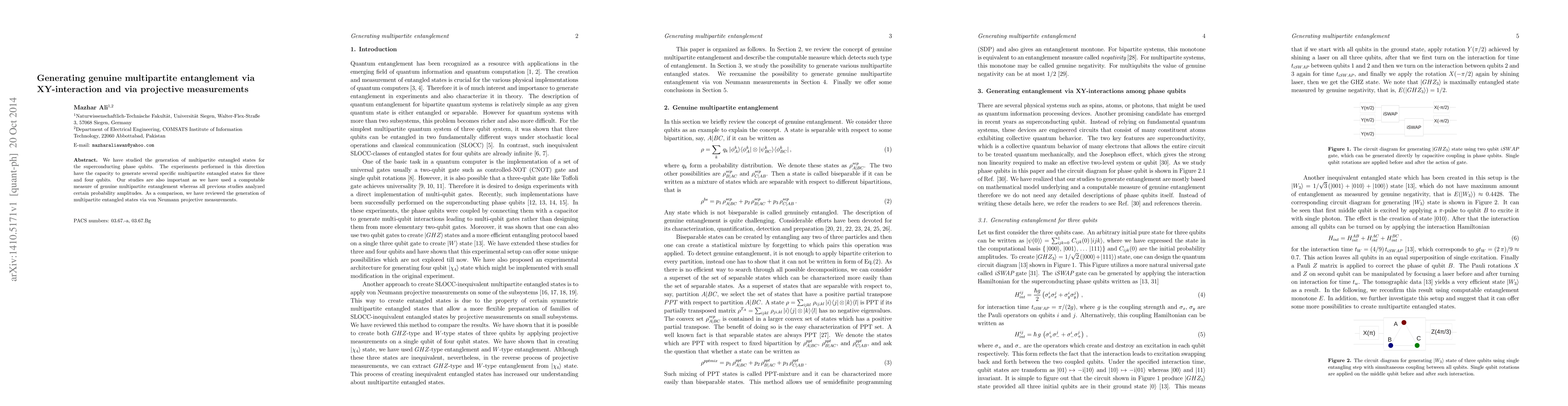 This paper investigates the creation of genuine multipartite entangled states in superconducting phase qubits through XY-interaction and projective measurements. It introduces a computable measure for genuine multipartite entanglement, contrasting previous studies that focused on probability amplitudes.