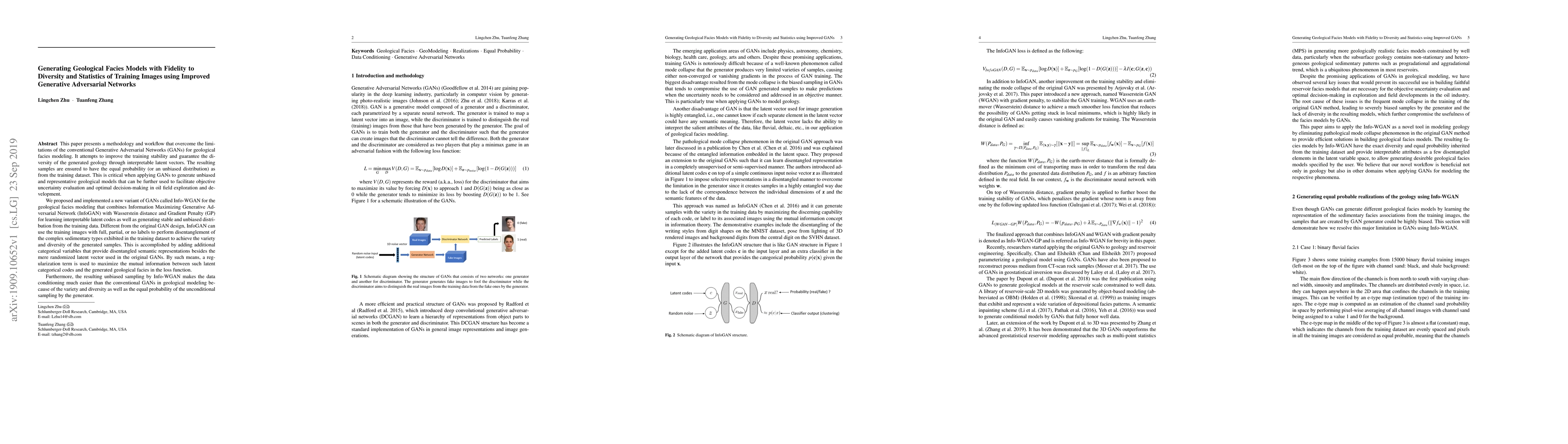 This paper introduces Info-WGAN, a novel variant of Generative Adversarial Networks (GANs) that enhances geological facies modeling by ensuring stable training, diversity, and unbiased distribution of generated samples. The method uses interpretable latent vectors and a regularization term to maximize mutual information, facilitating better representation of complex sedimentary types and aiding in objective uncertainty evaluation in oil field exploration.