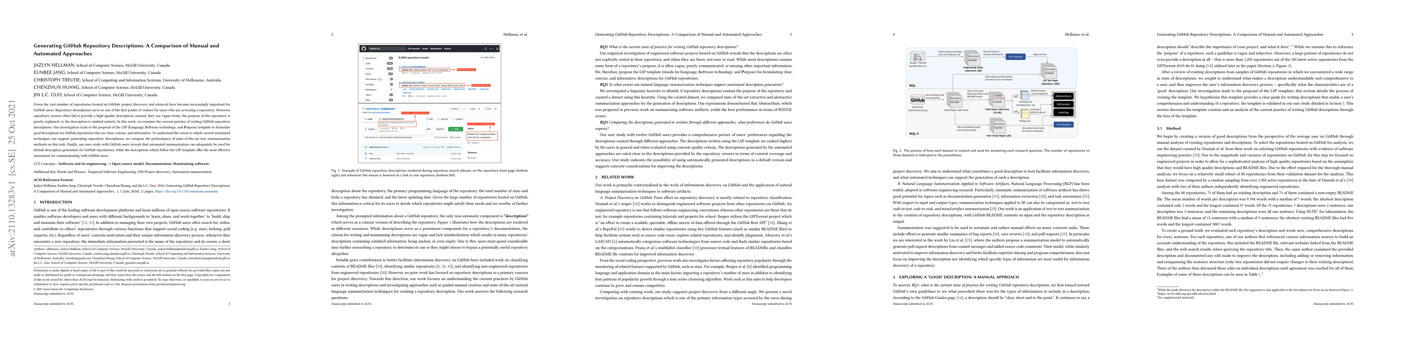 This paper investigates methods for generating GitHub repository descriptions, proposing the LSP template for clear and informative descriptions. It compares automated text summarization techniques and finds that while automated summarization is useful, descriptions adhering to the LSP template are most effective for user communication.