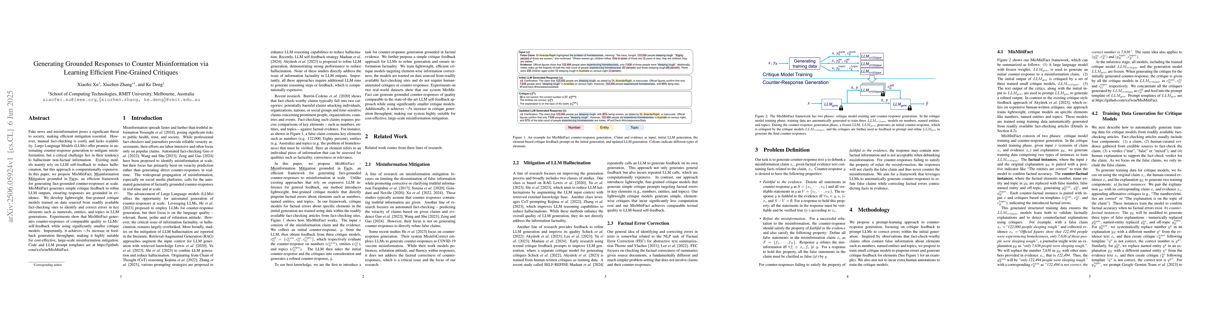 This paper introduces MisMitiFact, an efficient framework that generates fact-grounded counter-responses to combat misinformation. It uses lightweight critique models trained on data from fact-checking sites to correct errors in key elements of LLM outputs, achieving comparable response quality to LLMs' self-feedback but with 5x faster feedback generation, making it suitable for large-scale misinformation mitigation.