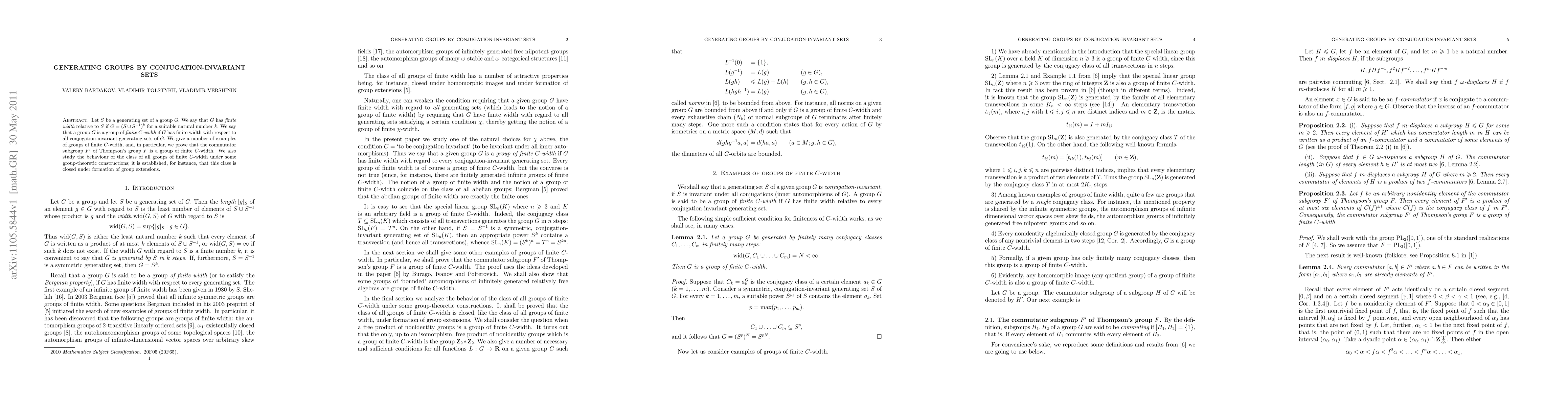 This paper explores groups with finite C-width, defined as those groups that can be generated by a finite number of elements from any conjugation-invariant generating set. It provides examples of such groups, including Thompson's group F', and examines how the class of finite C-width groups behaves under various group-theoretic constructions, such as group extensions.