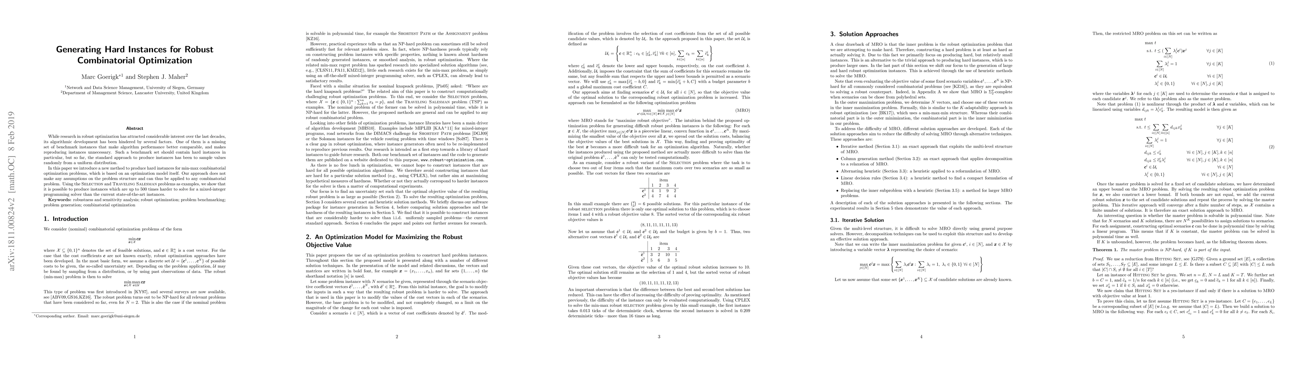 This paper introduces a new method to generate hard instances for min-max combinatorial optimization problems, based on an optimization model. Unlike random sampling, this method can produce significantly harder instances for problems like the Selection and Traveling Salesman, up to 500 times harder than current state-of-the-art instances.