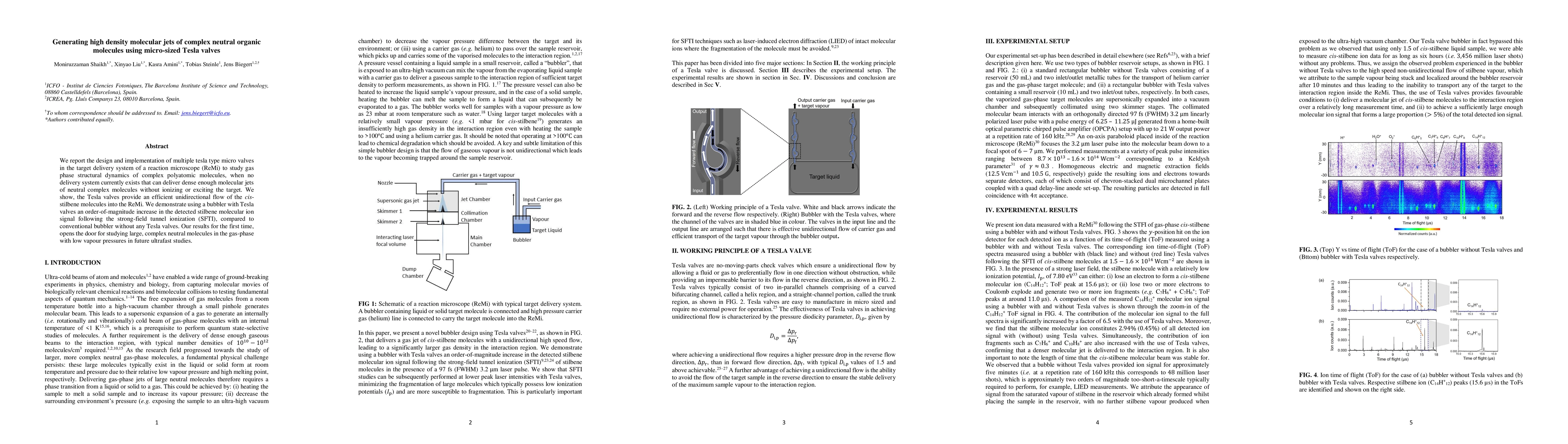 This paper describes the development of micro-sized Tesla valves for generating dense molecular jets of complex neutral organic molecules, enabling efficient delivery into a reaction microscope. The implementation of Tesla valves in the target delivery system results in a significant increase in the detected molecular ion signal, paving the way for future ultrafast studies of large, complex neutral molecules.