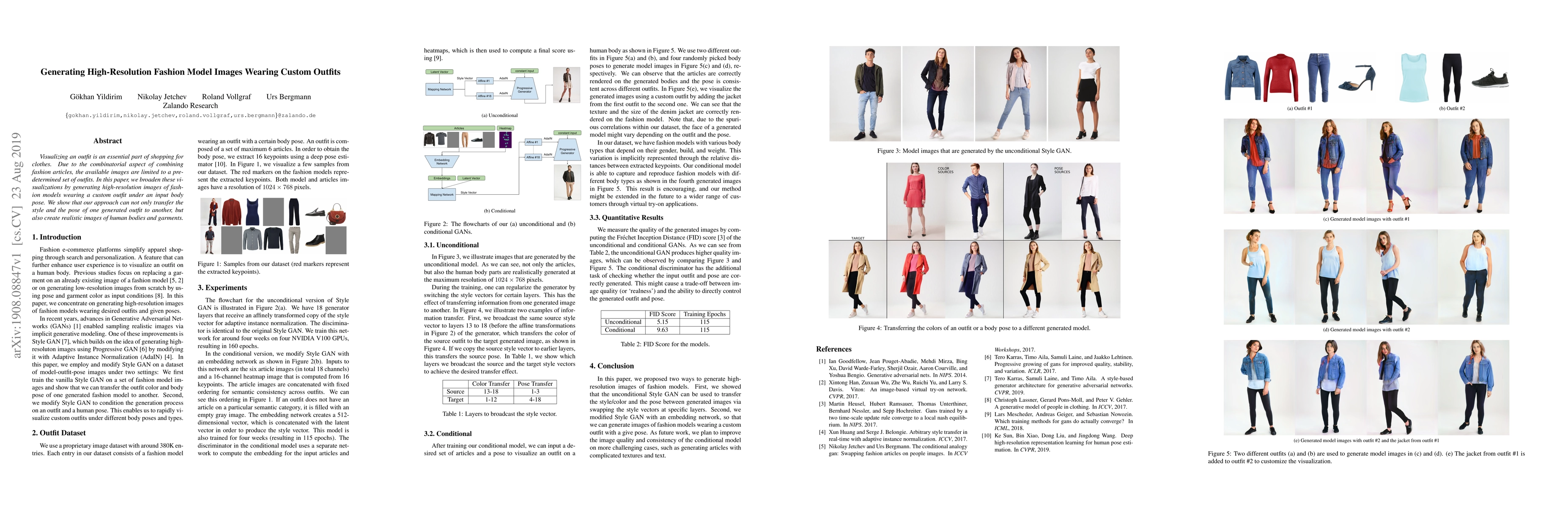 Visualizing an outfit is an essential part of shopping for clothes. Due to the combinatorial aspect of combining fashion articles, the available images are limited to a pre-determined set of outfits. In this paper, we broaden these visualizations by generating high-resolution images of fashion models wearing a custom outfit under an input body pose. We show that our approach can not only transfer the style and the pose of one generated outfit to another, but also create realistic images of human bodies and garments.